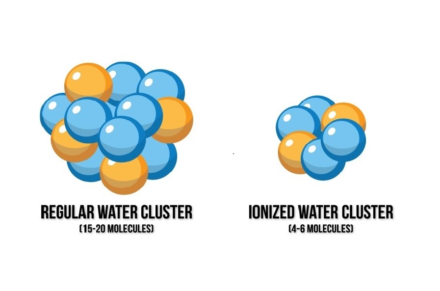 The ionization process breaks the electrical bonding of water molecules and restructures the water down to about 5-6 molecules per cluster.